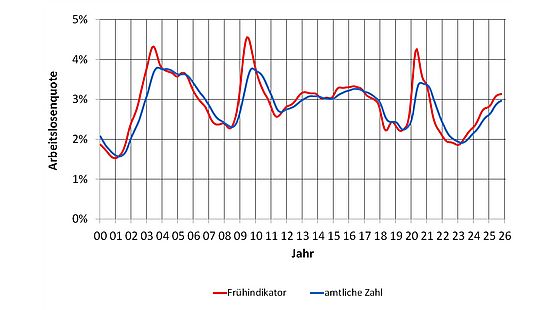 Die Arbeitslosenquote gibt den Anteil der Erwerbspersonen (Erwerbstätige und Arbeitslose) an, die an einem gegebenen Stichtag (hier am Monatsende) arbeitslos sind. Sie ist also stichtagsbezogen. Der Frühindikator für die Arbeitslosenquote ergibt sich aus dem Produkt des aktuellen Arbeitslosigkeitsrisikos und des Frühindikators für die Arbeitslosigkeitsdauer. Durch einen Vergleich der Entwicklungen der beiden Komponenten lässt sich feststellen, ob und gegebenenfalls in welchem Ausmass sie für eine Veränderung des Arbeitslosenquote-Frühindikators jeweils verantwortlich waren.