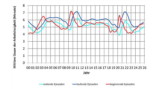 Die Dauer der Arbeitslosigkeit misst die Länge einer durchschnittlichen Episode von Arbeitslosigkeit in Monaten. Sie gibt Auskunft über die Stellenaussichten der Arbeitslosen. Die Dauer kann sich auf drei Personengruppen beziehen: (i) die Zahl der Personen, die den Arbeitslosenbestand in einem gegebenen Monat verlassen ("endende Episoden"), (ii) die Zahl der Personen, die am Ende des jeweiligen Monats noch arbeitslos sind ("laufende Episoden"), und (iii) die Zahl der Personen, die im betreffenden Monat dem Arbeitslosenbestand zugehen ("beginnende Episoden").