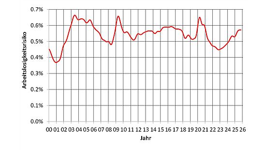 Das Arbeitslosigkeitsrisiko gibt den Anteil der Erwerbspersonen (Erwerbstätige und Arbeitslose) an, die während des jeweiligen Kalendermonats arbeitslos wurden. Im Unterschied zur Arbeitslosenquote ist das Arbeitslosigkeitsrisiko zeitraumbezogen und ergibt sich aus der Zahl der während des jeweiligen Monats erfolgten Eintritte von Personen in den Arbeitslosenbestand. Ein Wert von 0,6% beispielsweise bedeutet, dass 6 von 1000 Erwerbspersonen im betreffenden Monat arbeitslos wurden. Das Arbeitslosigkeitsrisiko liefert Informationen über das Ausmass an Entlassungen im jeweiligen Monat.